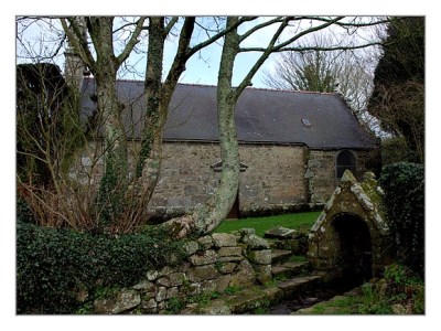 Le clocher abrite deux cloches. Dans l’enclos un calvaire du 16e et une fontaine de dévotion dont l’eau traverse un trou à lin, et un lavoir avant de se jeter en contrebas dans l’Aber Wrac’h.