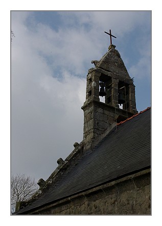 Le clocher abrite deux cloches. Dans l’enclos un calvaire du 16e et une fontaine de dévotion dont l’eau traverse un trou à lin, et un lavoir avant de se jeter en contrebas dans l’Aber Wrac’h.
