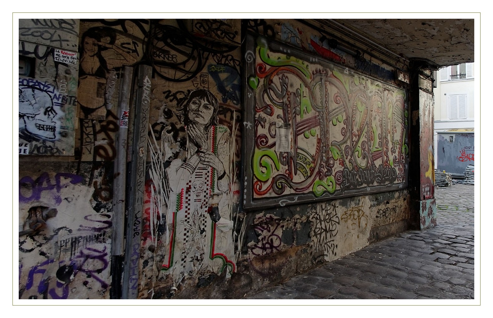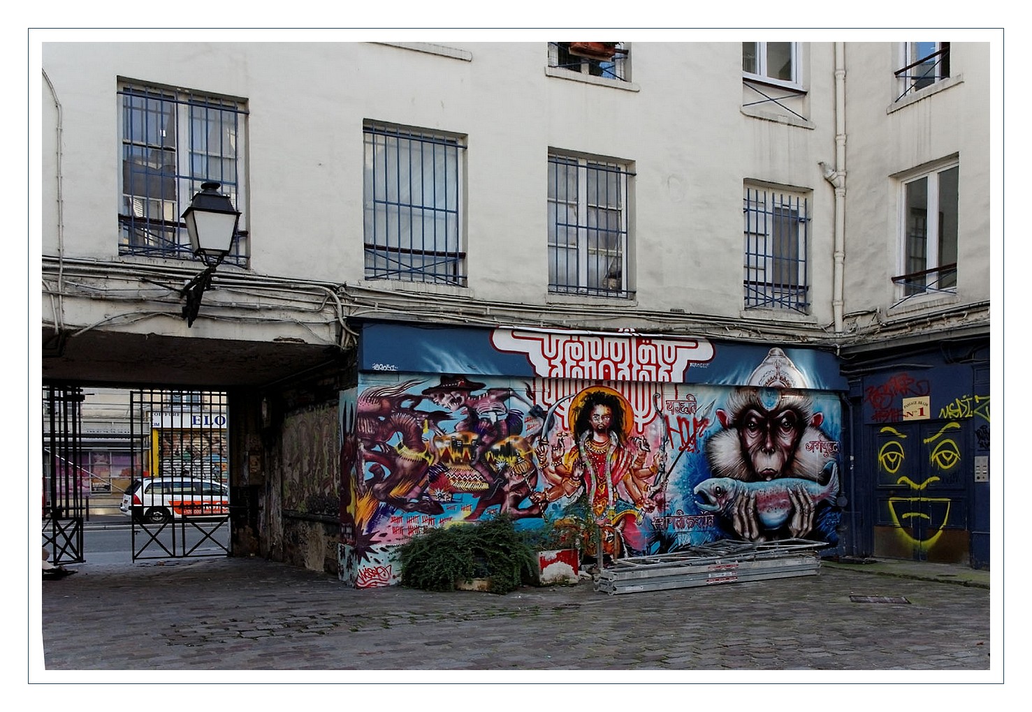 Aux premiers abords ce passage n’est pas très avenant 😕 l’entrée est constellée de tags aux couleurs violentes 😳 mais une fois l’appréhension passée, on se retrouve au coeur d’une petite place pavée, où sont actuellement entreposés de nombreux éléments d’échafaudage ! Une restauration semble en cours…