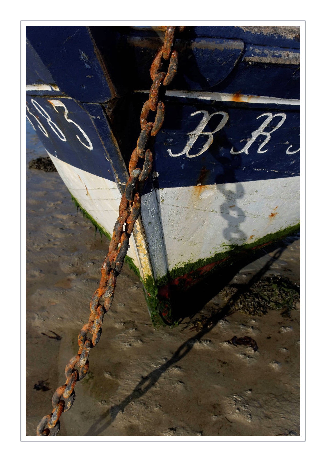 Photo bien construite, je trouve qu’il y a énormément à regarder. Rouille, bleu marine, chaine, vase, algues, ombre, impact des années…il y a sujets à réflexion.