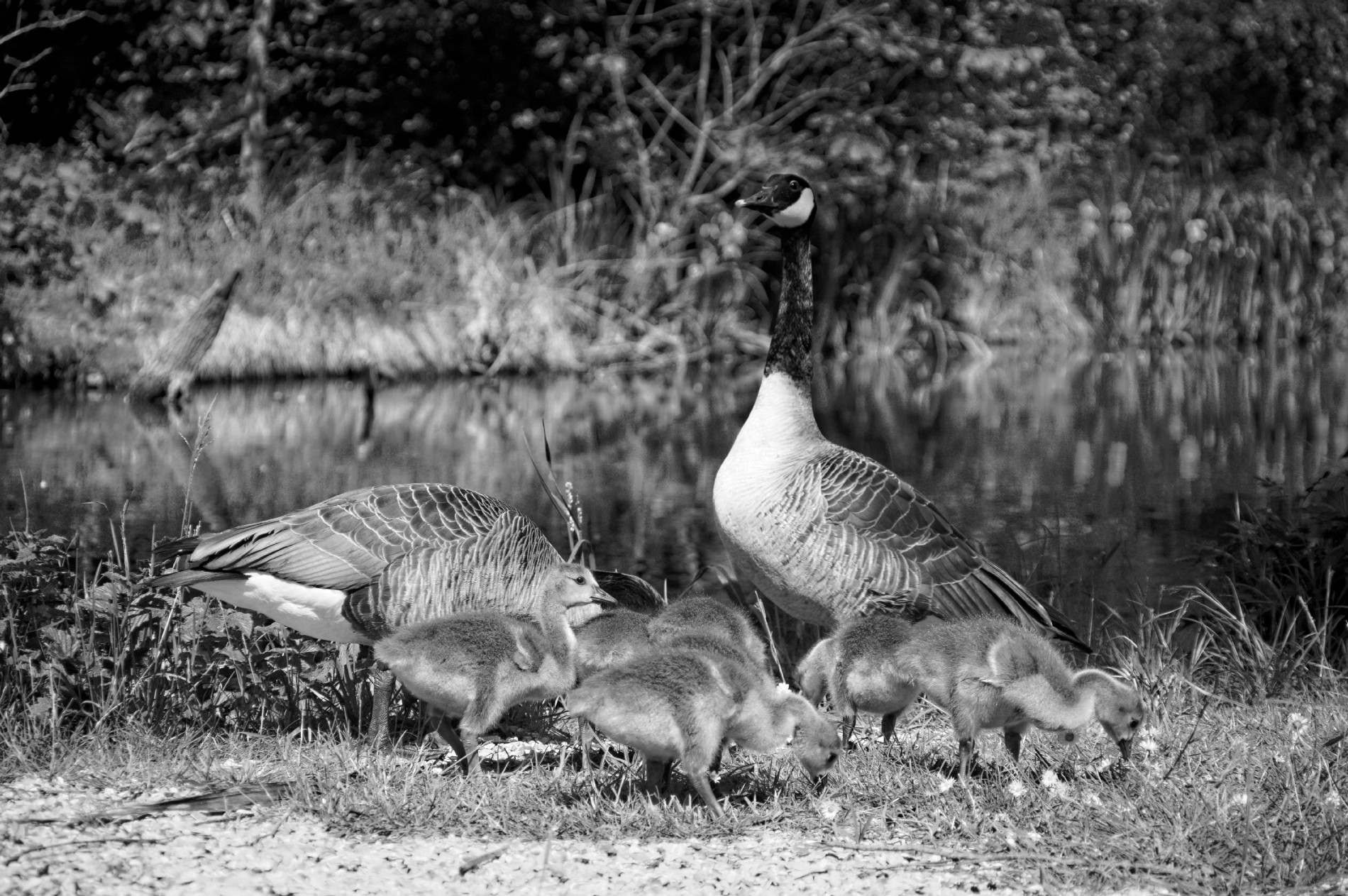 couple de Bernarches, bébés Bernaches, étangs de Baulne, fête des mères, noir et blanc