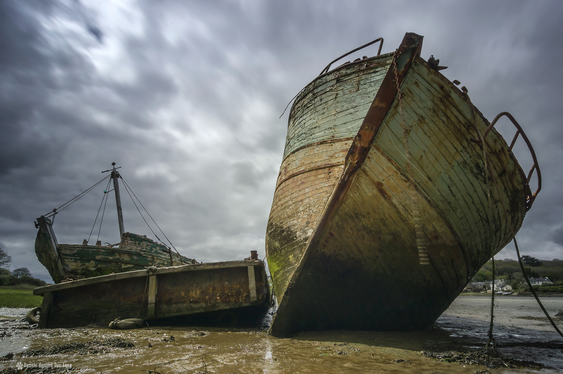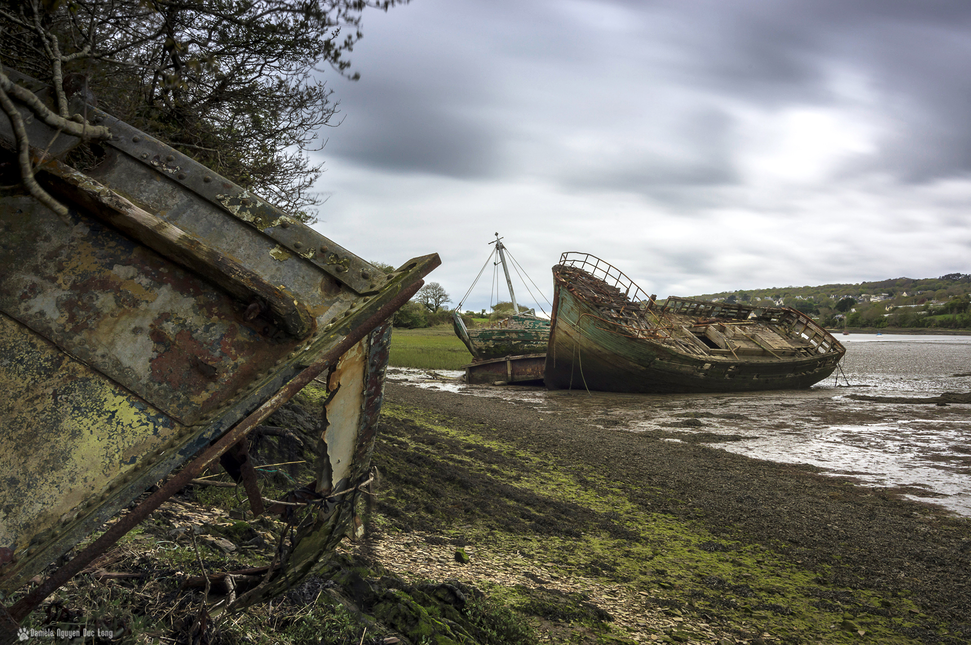 Retour vers Lauberlac’h…  de l’autre côté, dans l’anse, à  Saint-Guénolé, se cachent deux épaves blotties contre une barge. Elles s’enfoncent inlassablement dans l’estran pour y finir leur vie. C’est un lieu que j’affectionne, un peu hors du temps,  même si l’approche des coques est compliquée du fait de l’estran quasi impraticable, car on s’enfonce dangereusement. En 2013 lorsque j’y suis allée, la barge m’arrivait à hauteur de la poitrine, et désormais elle m’arrive aux genoux !